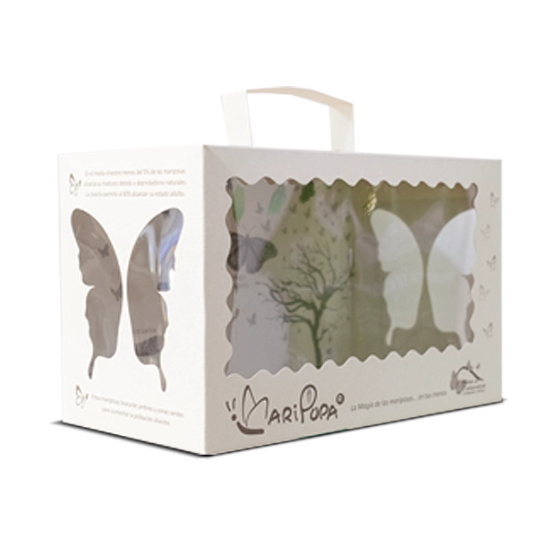 La caja incluye un pronóstico aproximado de nacimiento, fichas técnicas de las especies y una leyenda con el ritual simbólico, para que cada liberación tenga un sentido especial y profundo. Escoge entre 3 a 10 mariposas para ver nacer.